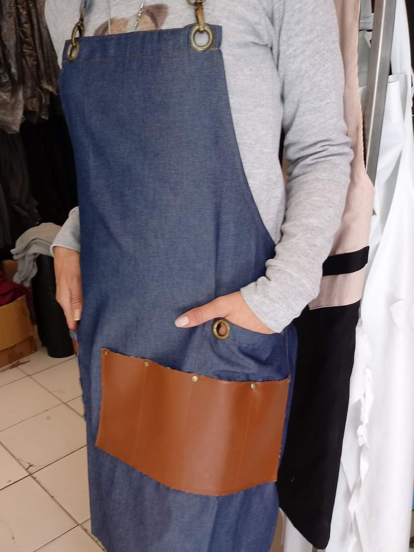 Delantal con peto de jean y cuerina